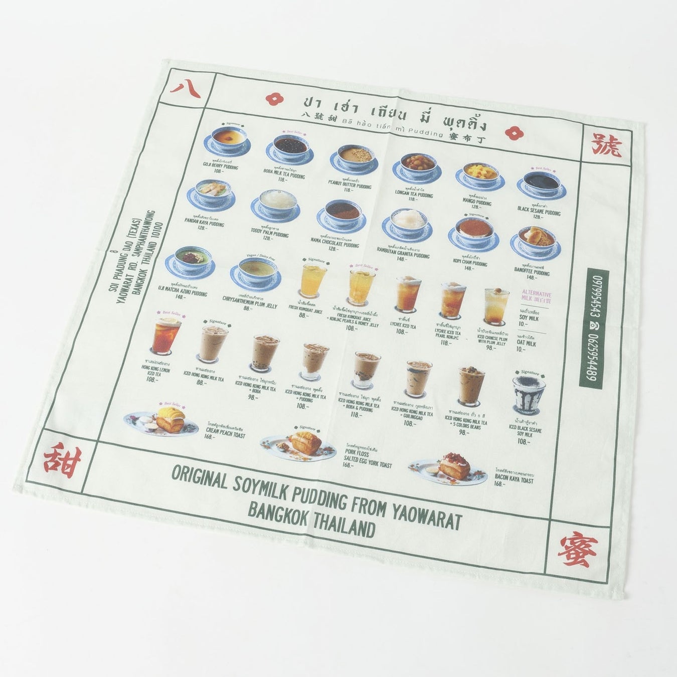 お店の人気メニュー表をそのままデザインしたバンダナハンカチ。見ているだけで思わず食べたくなる、美味しそうなプリンやドリンクが並んだ1枚です。