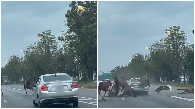 目撃者が撮影した映像では、銀色の乗用車が道路を走行中、馬の群れが至近距離で車の前に飛び出し、運転手はブレーキをかける間もなく激しく衝突する様子が映っていました。