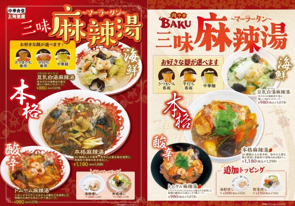 豆乳白湯、トムヤム味の「三味麻辣湯」フェアを上海菜館(アルーサ店)、肉中華BAKUにて開催!