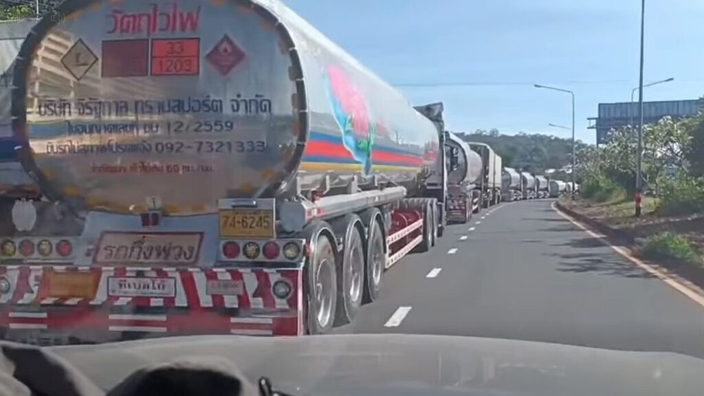ラオス検問所に燃料トラックの長い行列。カンボジアへの転売目的?! その燃料で戦闘継続か!