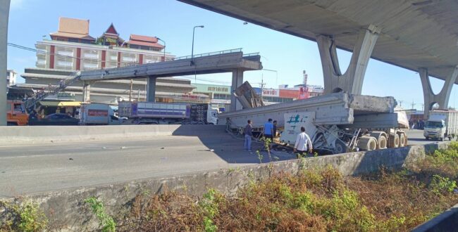 バンナートラート通り、トラックが荷台を上げたまま走行。歩道橋に直撃し崩落。1名死亡!
