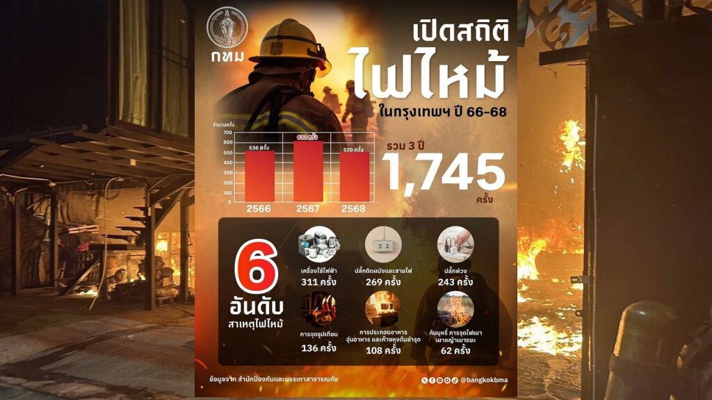 バンコク都防災・減災局によると、直近3年間(2023~2025年)の火災発生件数は計1,745件で、そのうち最も多い原因は「電気設備・電気製品」によるもので、823件に上った。