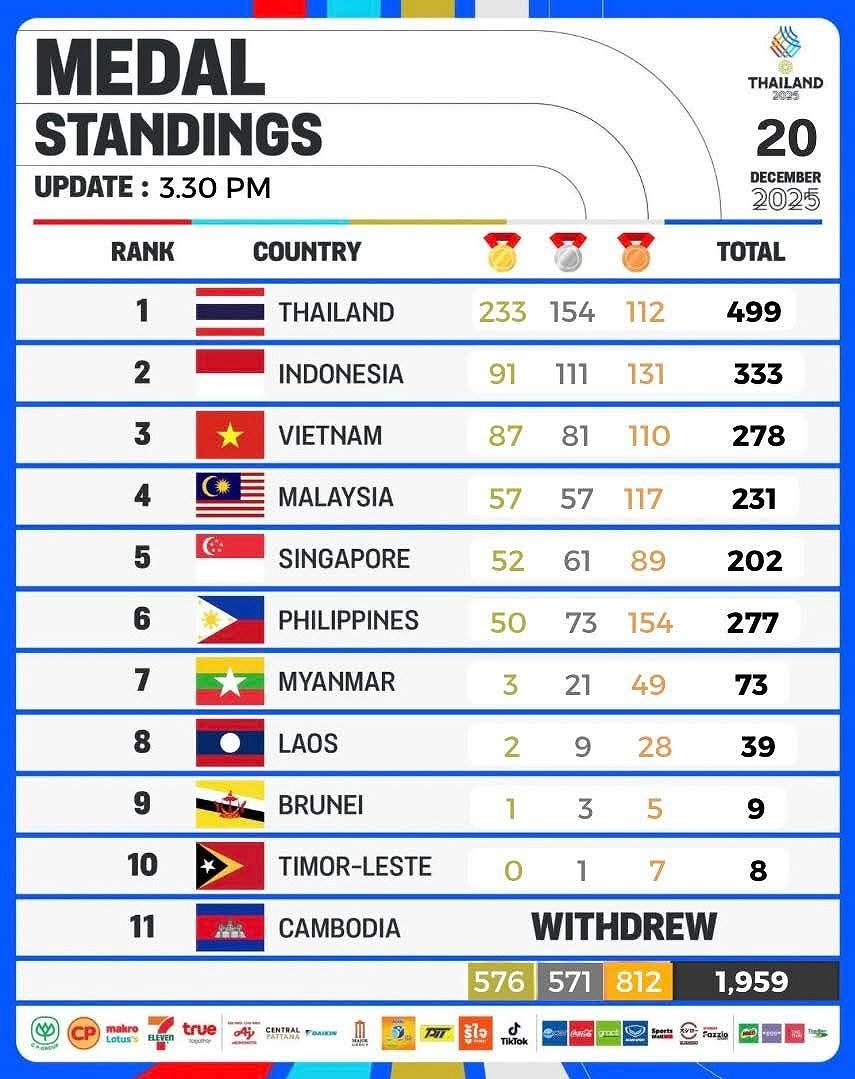 今大会でタイ選手団は金233、銀154、銅112の計499個のメダルを獲得し、SEA Games史上最多となる14回目の総合優勝を達成。
