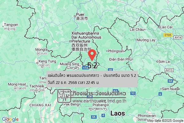 タイ気象局地震監視センターの発表によると、12月22日午後10時45分ごろ、ラオスと中国の国境付近を震源とするマグニチュード5.2の地震が発生した。