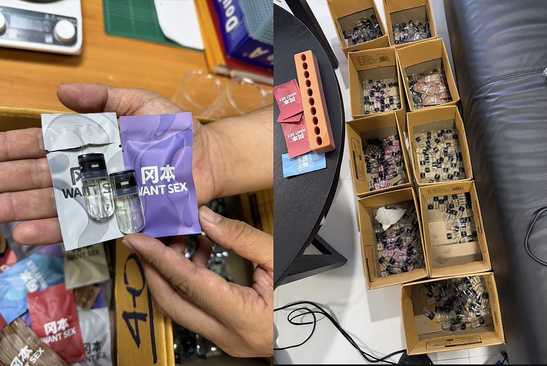 現場からは、販売可能な完成品552本のほか、空のカートリッジ、薬物生成に使用される器具、包装資材などが見つかった。