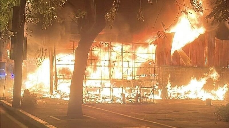 激しい炎が建物を包み込んでおり、消防隊が出動して約20分間の放水活動を行い、火は鎮圧された。