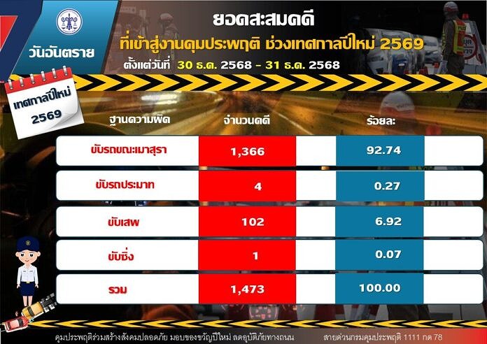 2026年1月1日、タイ保護観察局のピヤー局長は、年末年始の集中取締期間の2日目(2025年12月31日)に、新たに保護観察プロセスに送られた刑事事件の統計を公表しました。