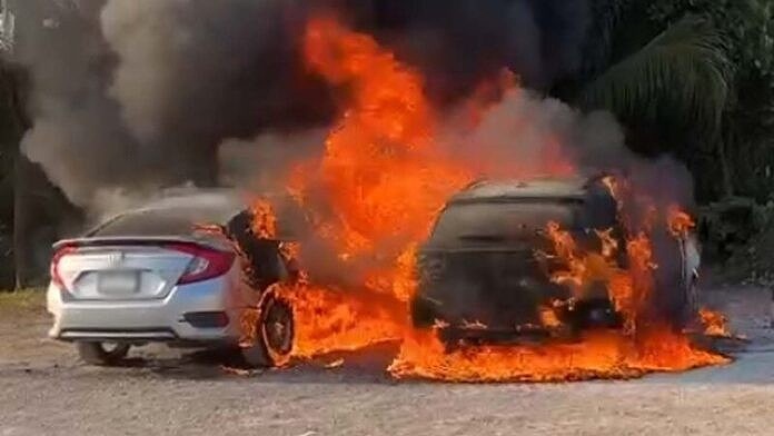 あなたの車でも起こりうる?!タイ中部、市場で買い物中に車が突然発火!隣の車も全焼。