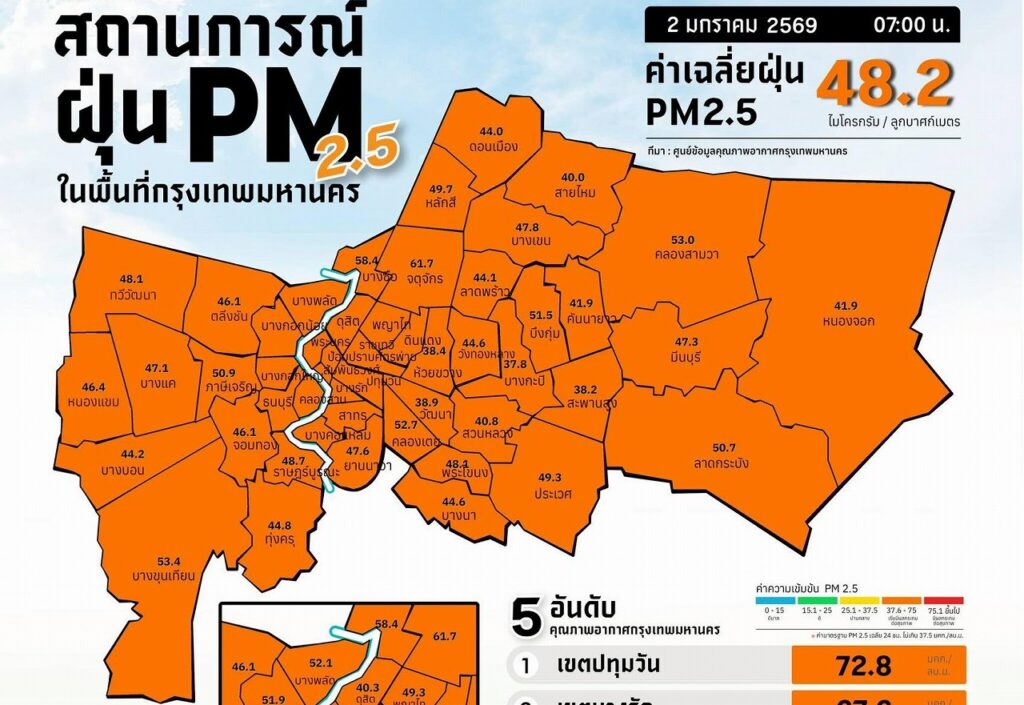 バンコク大気質情報センターは1月2日午前7時時点で、バンコク全域の大気汚染レベルが「オレンジ(警戒)」段階に達したと発表した。