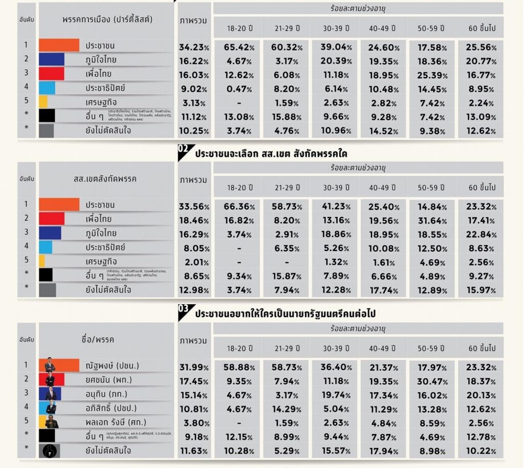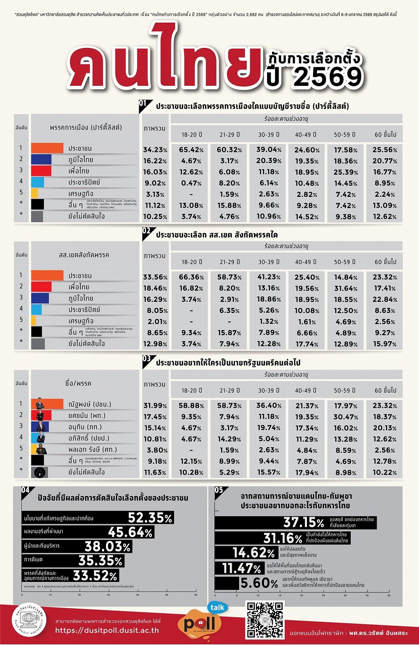 スアンドゥシット大学が、2026年1月6日~9日に全国の有権者2,682人を対象に実施した世論調査で、国民党(People’s Party)が比例代表・小選挙区の両方で最も高い支持を集め、同党党首のナタポン・ルアンパンヤーウット氏(ณัฐพงษ์ เรืองปัญญาวุฒิ)が次期首相候補として首位に立っていることが分かった。