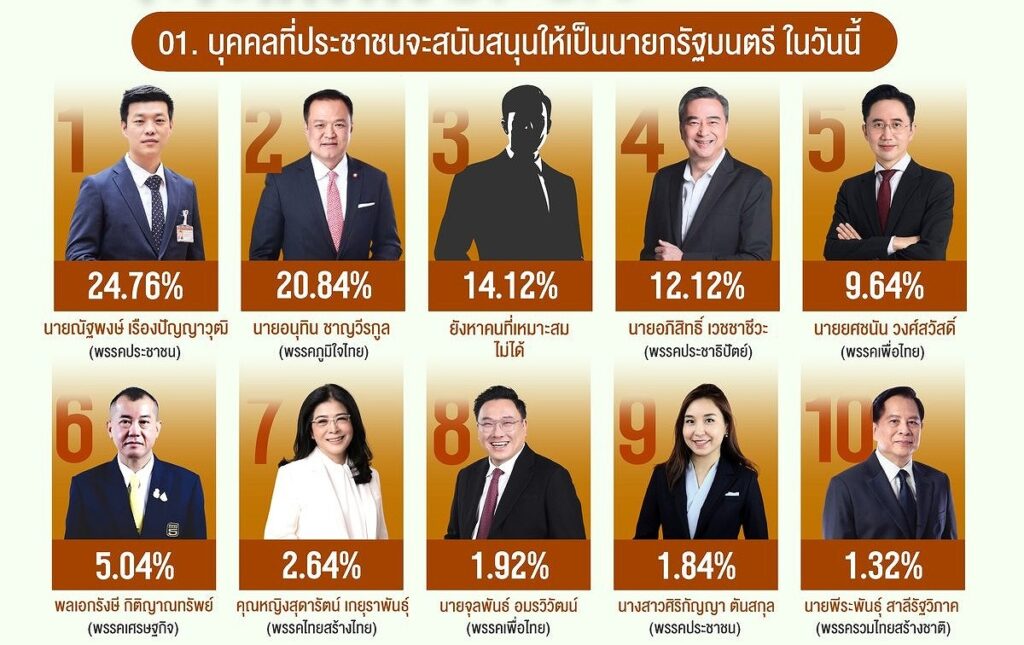 タイ世論調査、2026年総選挙第1回調査結果。国民が期待する次期首相1位ナタポン氏(国民党)