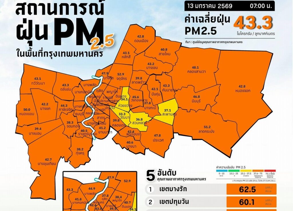 バンコク全体の平均値は 43.3µg/㎥(基準値37.5µg/㎥)で、空気質は「中程度(オレンジレベル)」となり、多くのエリアで健康への影響が出始める水準に達している。