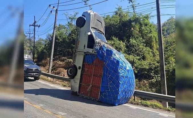 タイ・カンチャナブリーの道路で、ピックアップトラックが仁王立ち! 一体どうした?