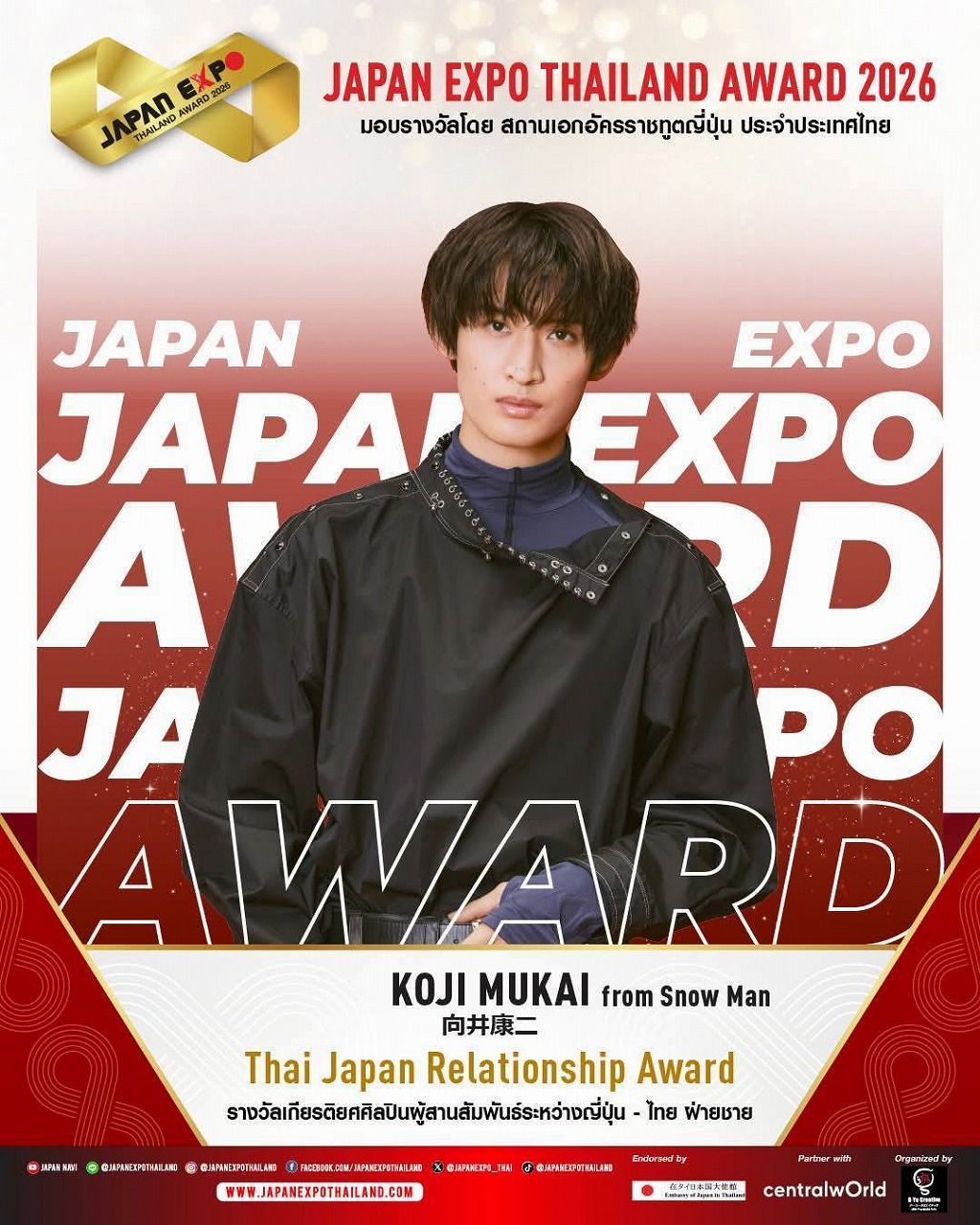向井康二(Snow Man)さんが、日タイの架け橋として活躍したアーティストに贈られる名誉ある賞「THAI JAPAN RELATIONSHIP AWARD」を受賞することが決定しています。