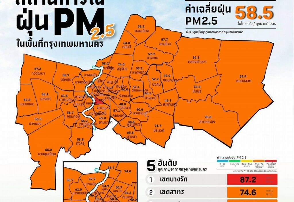 バンコク都全体の平均値は58.5マイクログラム/立方メートルだった。