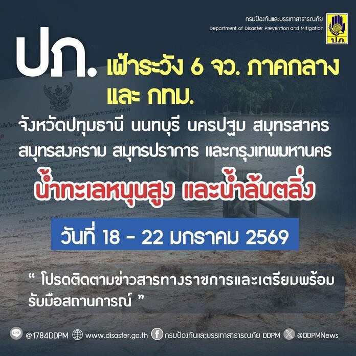 1月16日、タイ防災・減災局は、海軍水路局からの通知を受け、1月18日~22日にかけてチャオプラヤー川の水位が上昇する見通しを示している。
