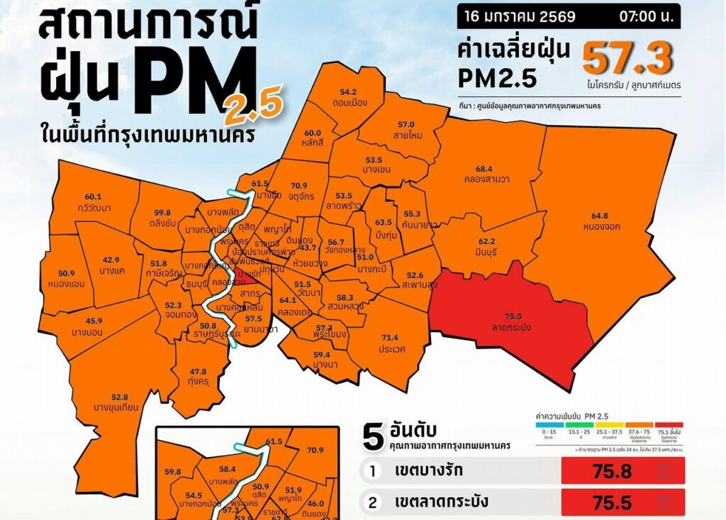 バンコク都大気質情報センターは、2026年1月16日午前7時時点のバンコク都における微小粒子状物質(PM2.5)の状況を発表した。