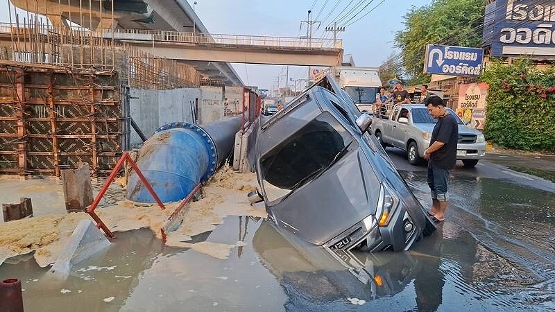 1月17日午前6時30分頃、サムットサコーン県のラマ2世通り(バンコク方面行き側道)で、道路が突然陥没し、走行中のピックアップトラックが大きな穴に転落する事故が発生した。