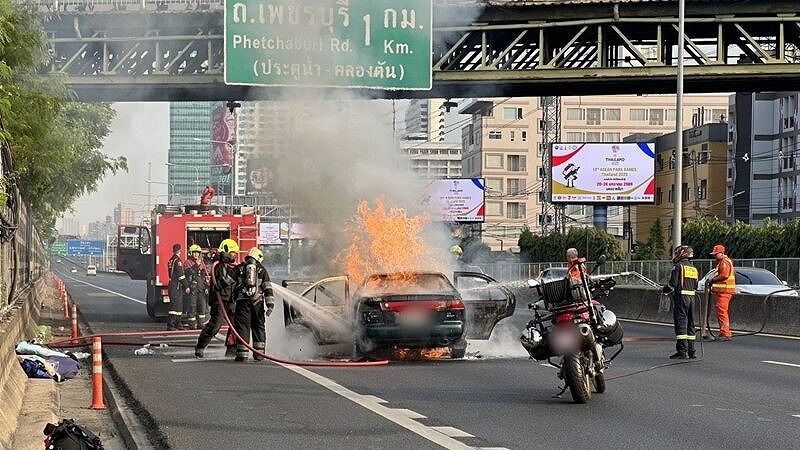 バンコク高速道路上で車両火災。乗用車が突然炎上、けが人なし。
