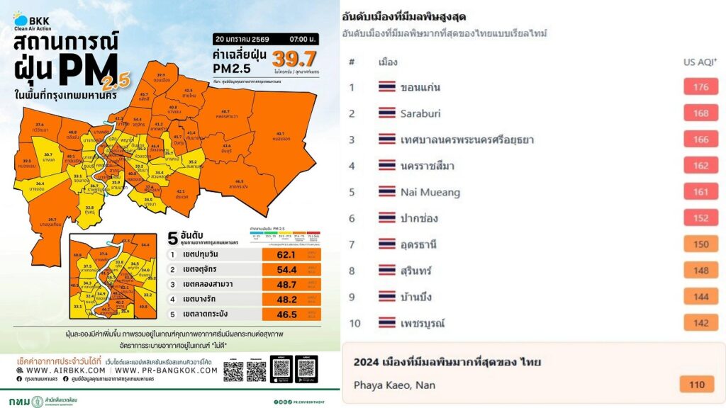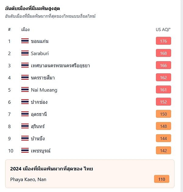 同サイトが発表したタイ国内で汚染が最も深刻な都市ランキングトップ10によれば、今朝は「コンケン県」が国内で最も大気汚染レベルが高いことが確認された。
