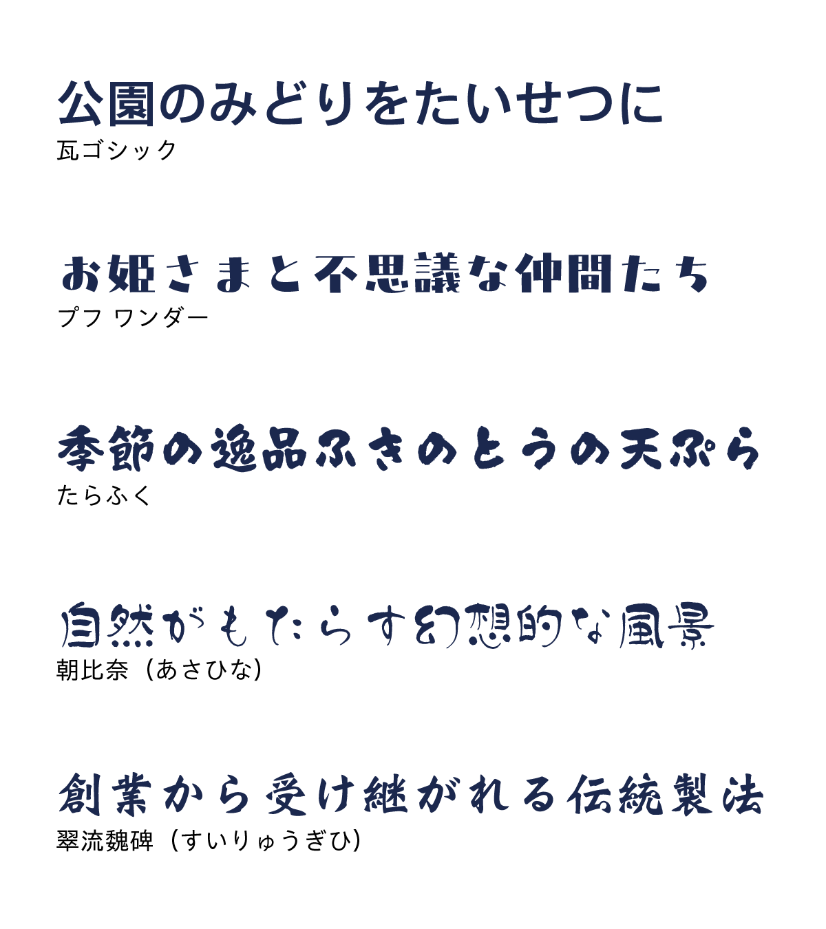 和文フォントからは、2023年にリリースした毎日新聞社による開発書体「瓦明朝」のゴシック体シリーズである「瓦ゴシック」、2022年から好評いただいている「プフ」シリーズから新たに「プフ ワンダー」、書家による毛筆の文字が元となった「たらふく」「朝比奈(あさひな)」、中国の北朝時代の石拓の書に由来する字形やスタイルを取り入れた「翠流魏碑(すいりゅうぎひ)」をリリースします。