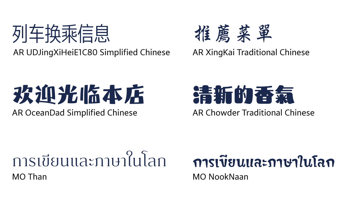 また中国語フォントは、同じく2024年度よりMorisawa Fontsに加わったArphic Typesの簡体字・繁体字フォントに加え、今回新たに上海印刷技術研究所の簡体字フォントをリリースします。