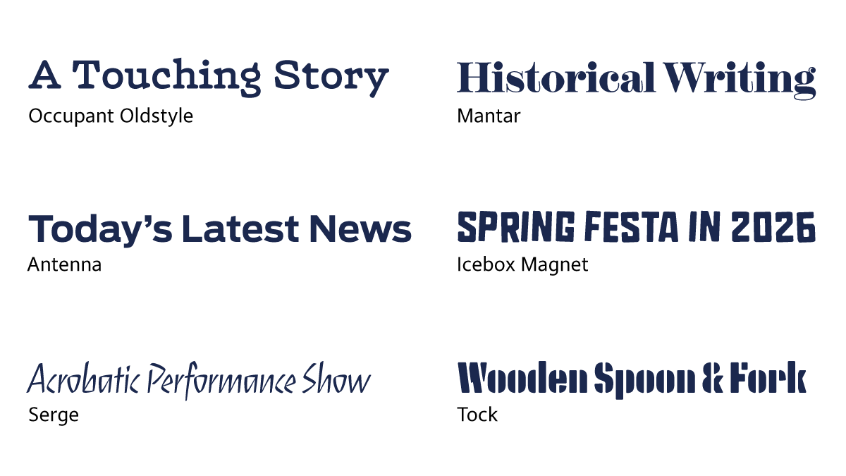 欧文フォントは、2024年度よりMorisawa Fontsに仲間入りしたOccupant Fontsのライブラリがさらに充実します。ラウンデッドサンセリフや和文書体の明朝体から着想を得た穏やかな印象のセリフ体「Occupant Oldstyle」や、インダストリアルデザインを想起させる力強さとあたたかみを兼ね備えたサンセリフ体「Antenna」など、バラエティに富んだ計39ファミリー405フォントです。