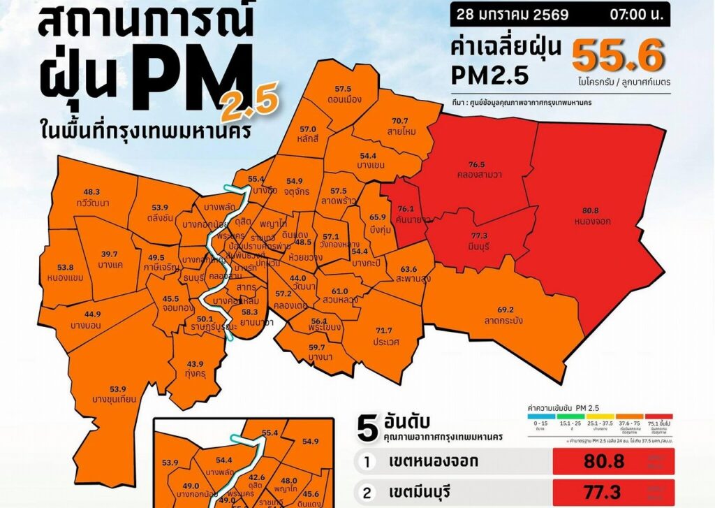 タイの大気汚染、世界ワースト14位! バンコクでもPM2.5急上昇、4地区が赤レベル。