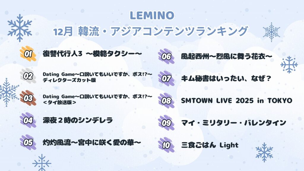 【Leminoで2025年12月に視聴されている人気の韓流・アジアコンテンツTOP10】