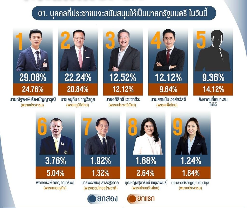 - タイ世論調査、国民党が支持率首位キープ! 首相候補はナッタポン氏がトップのまま。