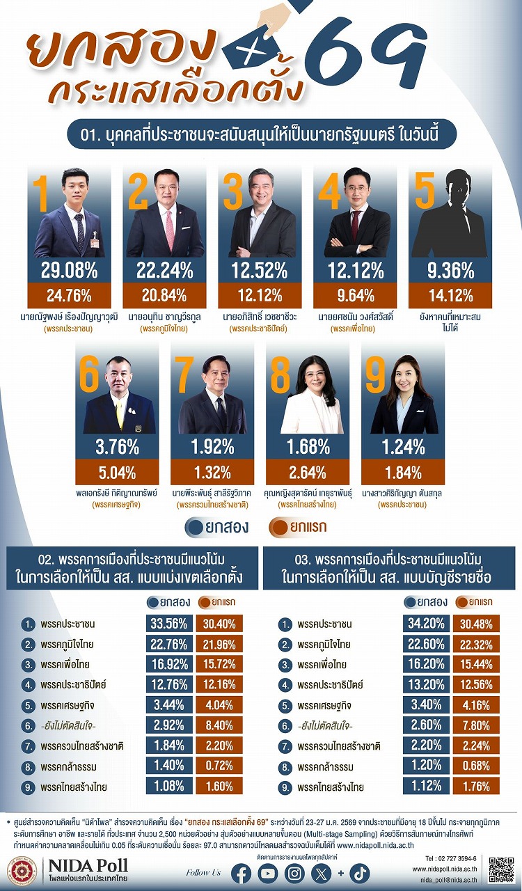 1月30日、国立開発行政研究院(NIDA)は、最新の世論調査結果 「2026年総選挙動向・第2回調査」 を公表した。