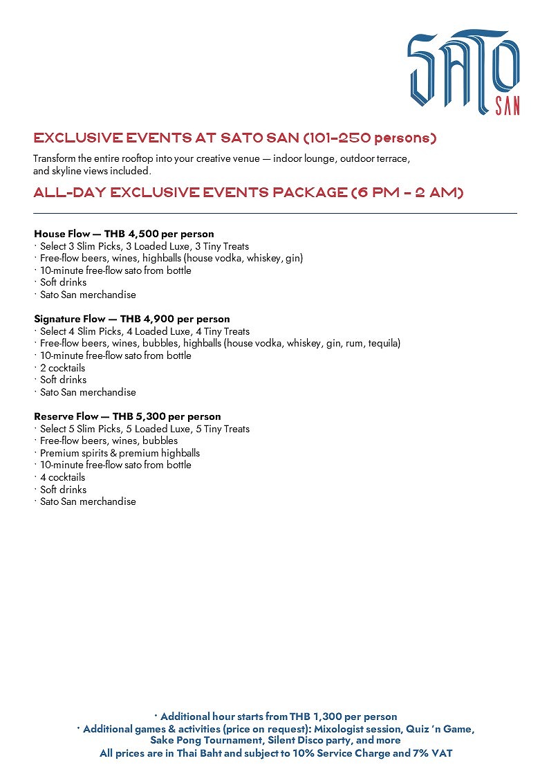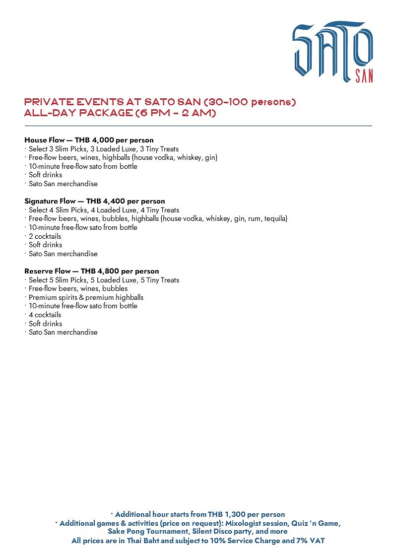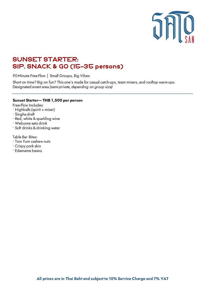 ハイボール、シンハー生ビール、赤・白・スパークリングワインのフリーフロー、ウェルカムのサトーショット、ノンアルコール飲料に加え、トムヤム風カシューナッツ、クリスピーポークスキン、枝豆などのシェアバーフードを提供。人数に応じて半個室エリアも利用可能。