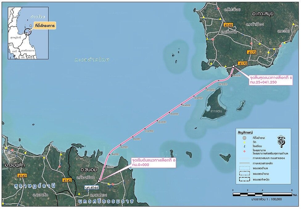 計画によると、総延長は37.41キロメートル。スラータニー県ドンサック郡を起点に、ナコンシータマラート県カノム郡を経由し、サムイ島へ至る4車線の高速道路を整備する。