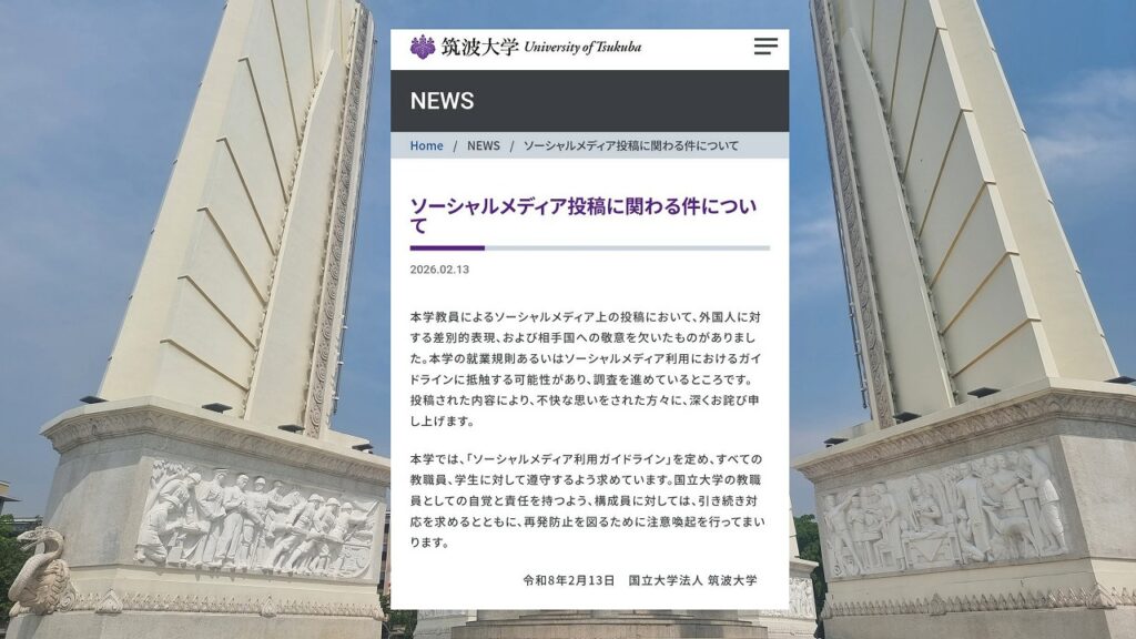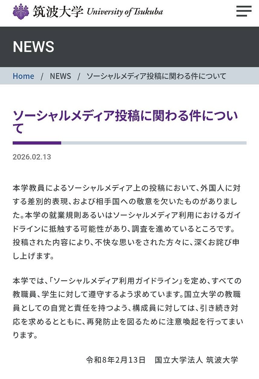 筑波大学は2月13日、「ソーシャルメディア投稿に関わる件について」と題する声明を発表した。