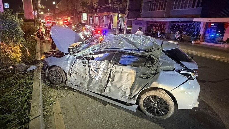 ホンダ・シティがタクシーと接触後、制御を失って中央分離帯を乗り越え、そのままBTSスカイトレインの高架支柱に激突したという。