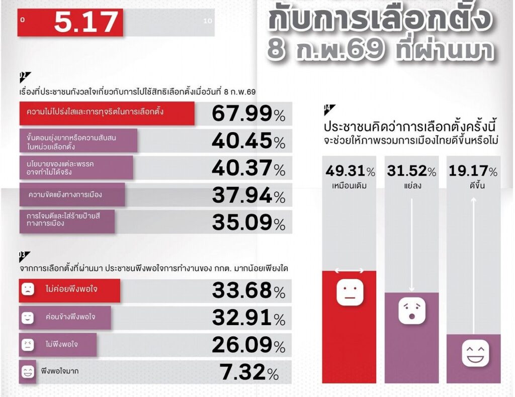 スアンドゥシット・ポールが1,231人を対象に実施した世論調査によると、2月8日の総選挙における選挙管理委員会(EC)の対応について、59.77%が「不満」と回答し、67.99%が「不正や透明性の欠如を懸念している」と答えた。