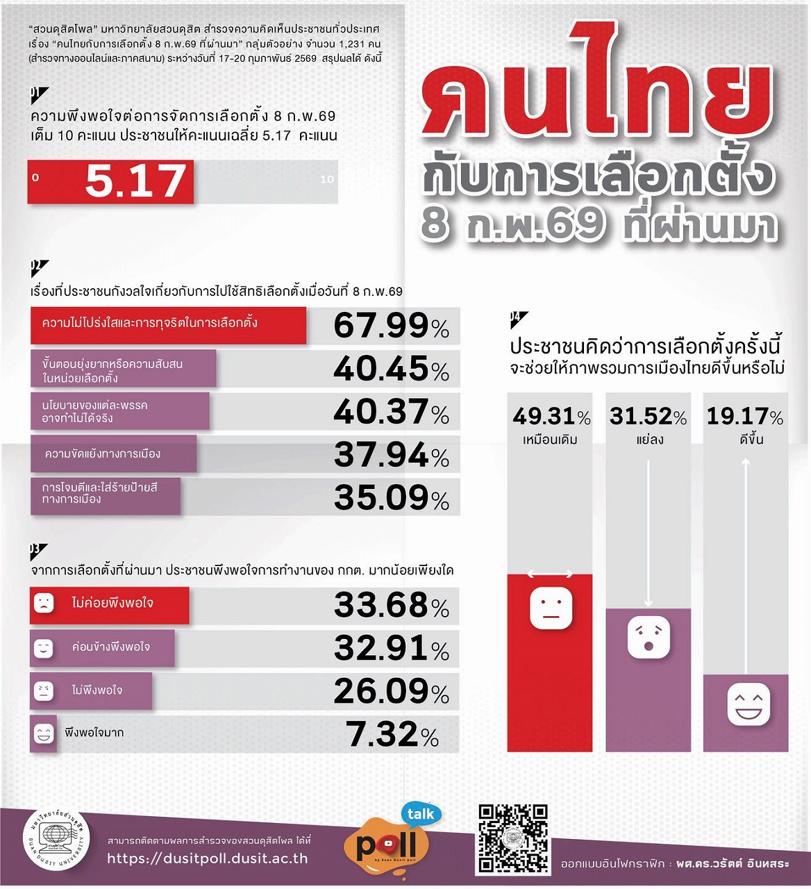 この調査は、スアンドゥシット大学のスアン・ドゥシット・ポールが2月17日から20日にかけて全国の1,231人を対象に実施したものだ。