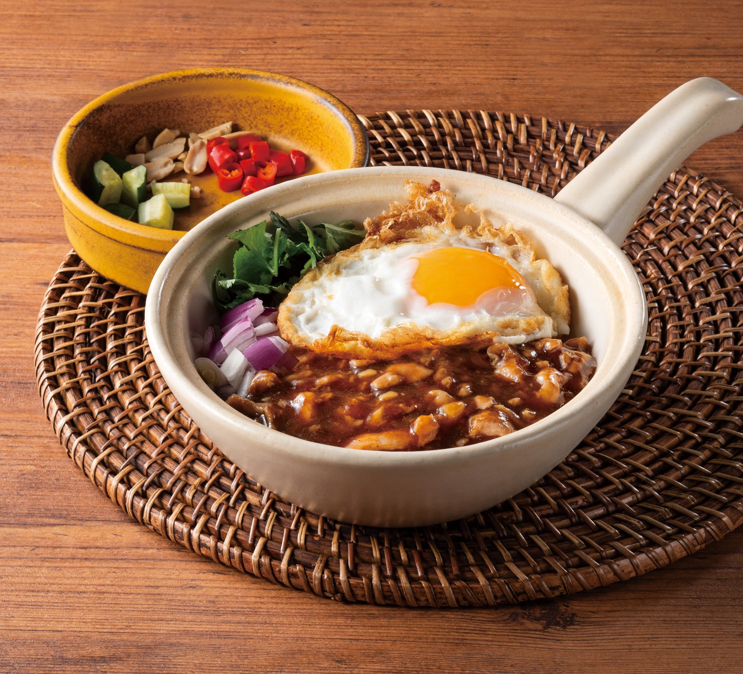 マンゴツリーカフェで販売する「鶏肉のあんかけご飯~カオナーガイ~」は、鶏ひき肉を炒め、シーユーワン(甘口タイ醤油)とオイスターソースをベースに仕立てたあんをご飯にかけた一皿です。