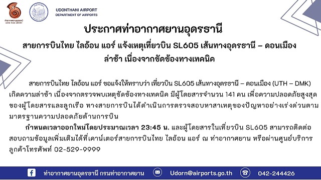 2月23日、ウドンタニ空港(空港局)は、SL605便(ウドンタニ―ドンムアン線、UTH-DMK)が技術的な不具合の発見により遅延したと正式に発表。