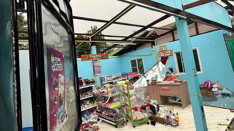 ワット・プラップラー校では、突風により駐車場の金属製屋根が鉄骨ごと吹き飛ばされ、校外の道路に落下。