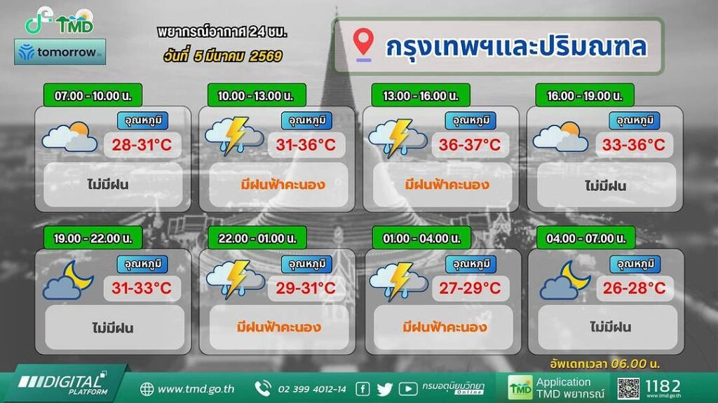 タイ気象局は、今後24時間の天気予報を発表し、東北部・東部・北部・中部の広い範囲で「夏の嵐」が発生する見込みだと警告した。