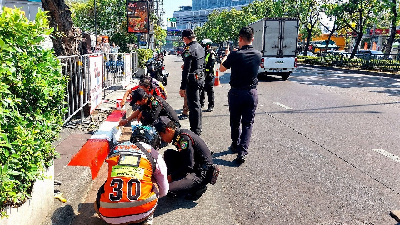 交通警察のホイクワン署とディンデーン区の市職員は、ジョッドフェア前の道路に白赤のラインを設置し、全面的な駐車禁止区域を設定した。