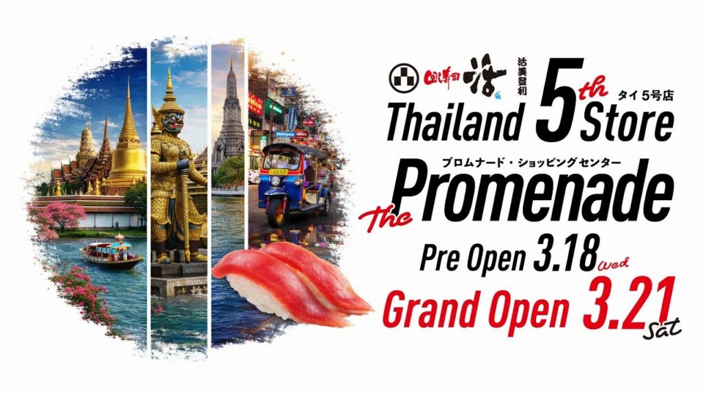株式会社活美登利(本社:東京都品川区、代表取締役社長:土屋秀仁)が運営する「回し寿司活/寿司活」は、タイ王国内5号店となる「回し寿司 活 プロムナード店」を3月にオープンいたします。