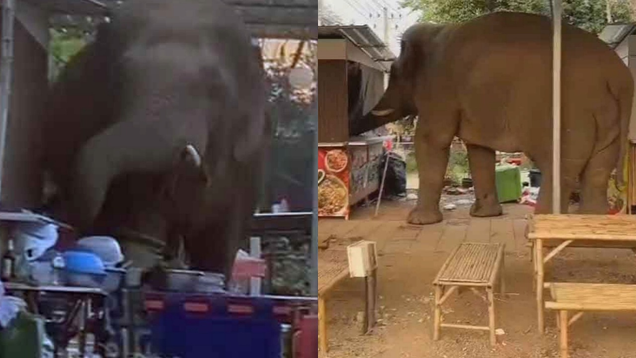 ゾウはムーシー地区の市場で食べ物を探し、ソムタム販売用のカウンターをへこませるなどし、食材の入った箱を倒して中身を散乱させた。