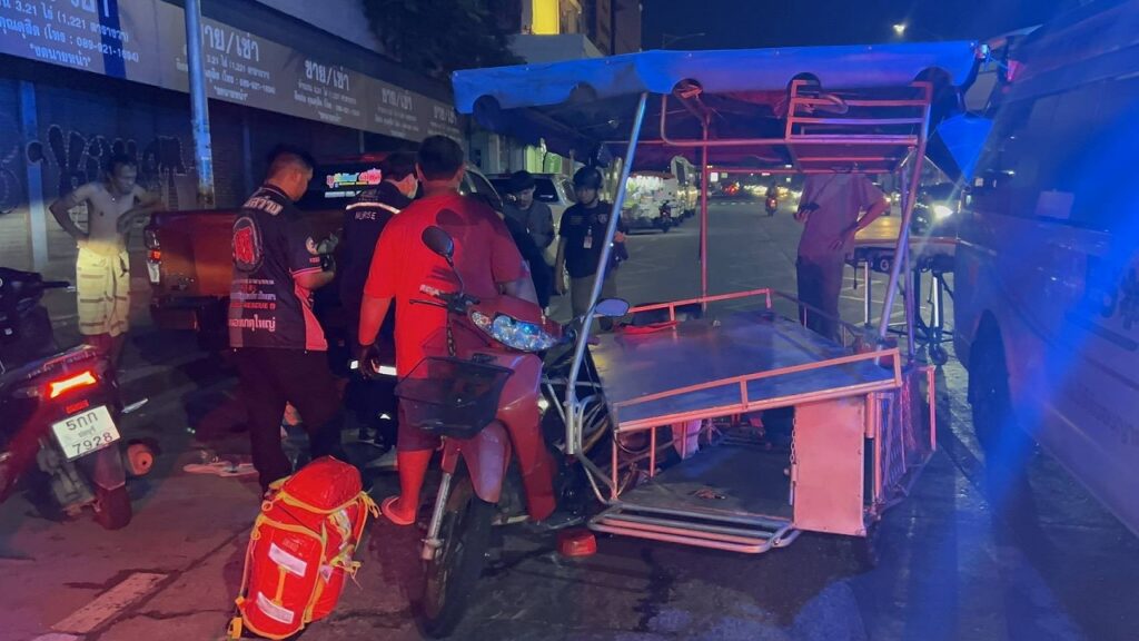 パタヤ市中心部で3月15日早朝、屋台販売に使われるサイドカー付きのバイクが事故を起こし、運転していた女性が重傷を負った。