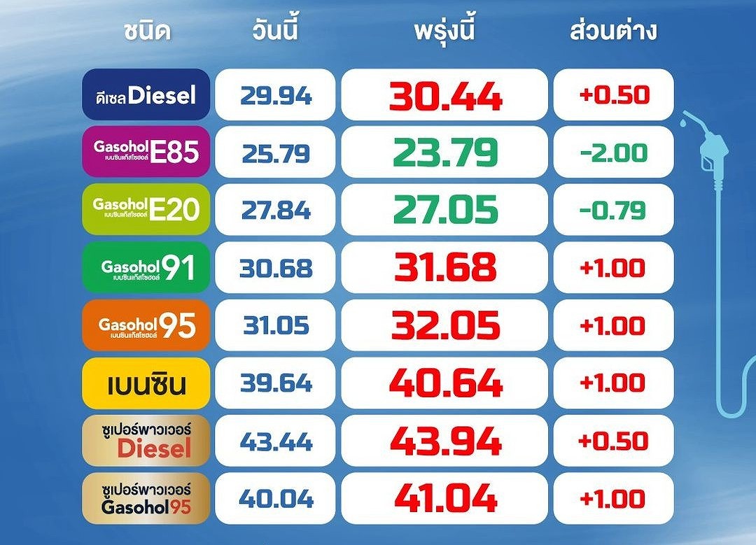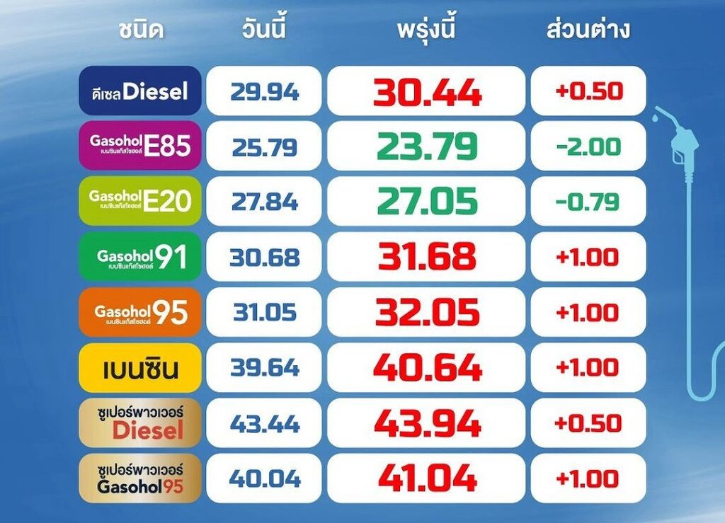 ガソリンおよびガソホール95は1リットルあたり1バーツ値上げ、一方でE20は1リットルあたり0.79バーツ値下げとなります。
