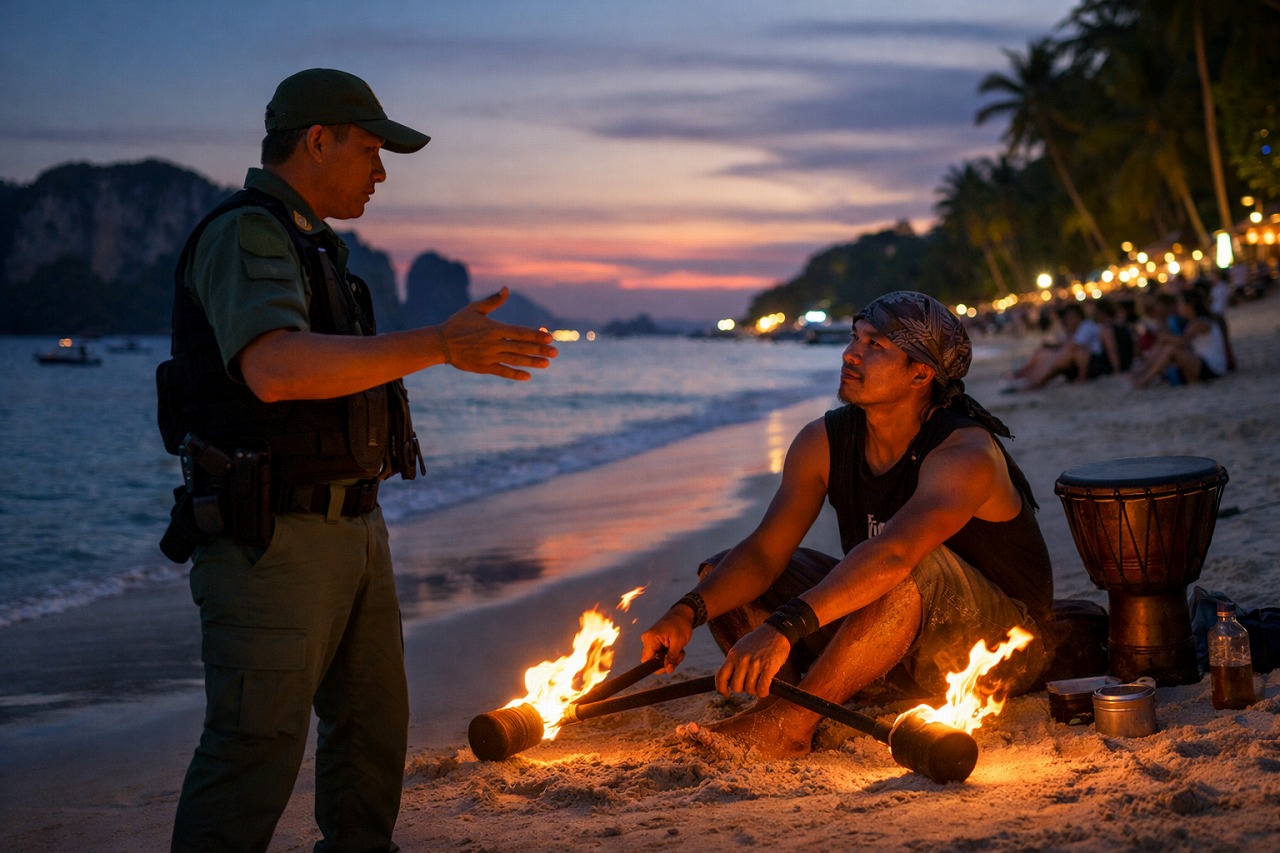 タイ南部クラビ県アオナンビーチで、ファイヤーダンスショーで生計を立てていた障がいのある男性が、当局から中止を命じられたことを受け、SNS上で議論が広がっている。