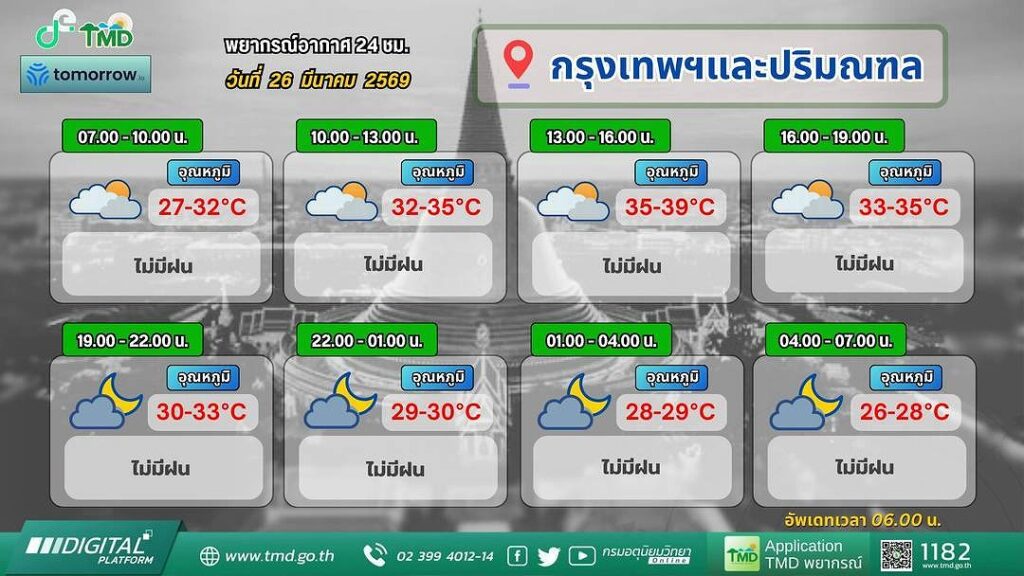 タイ気象局は3月26日、今後24時間の天気予報を発表し、全国的に暑い天候が続き、日中はかすみがかかる見込みだと明らかにした。