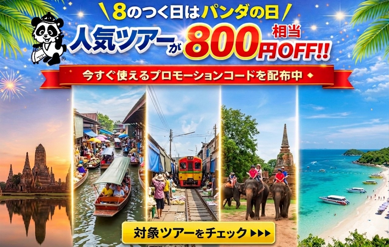 タイ旅行【毎月3回のチャンス】“8の日”限定キャンペーンで人気ツアーが800円OFFに!パンダバス。