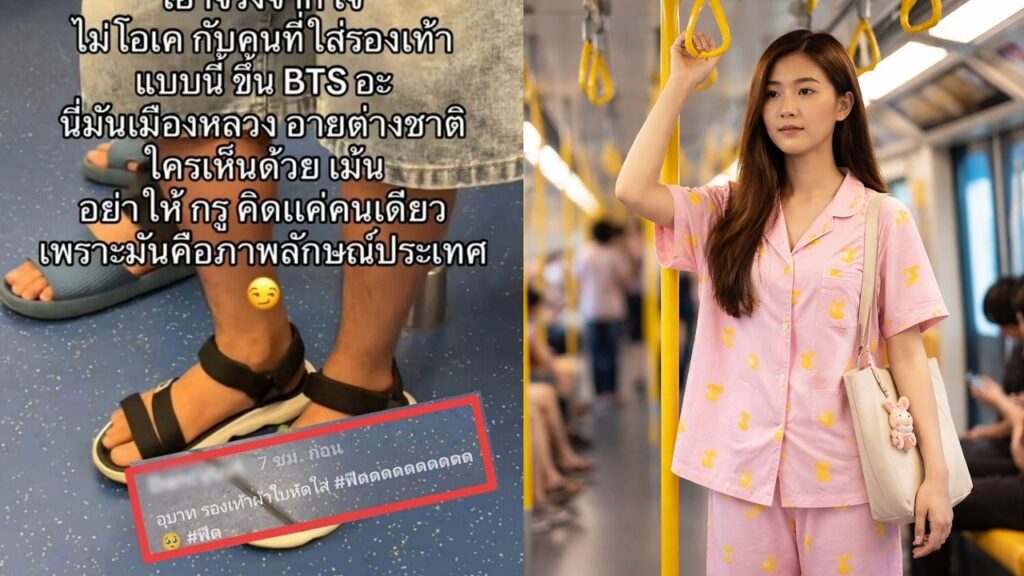 バンコクのBTSスカイトレイン内でビーチサンダルを履いた乗客の写真がSNSに投稿され、ネット上で賛否を呼んでいる。